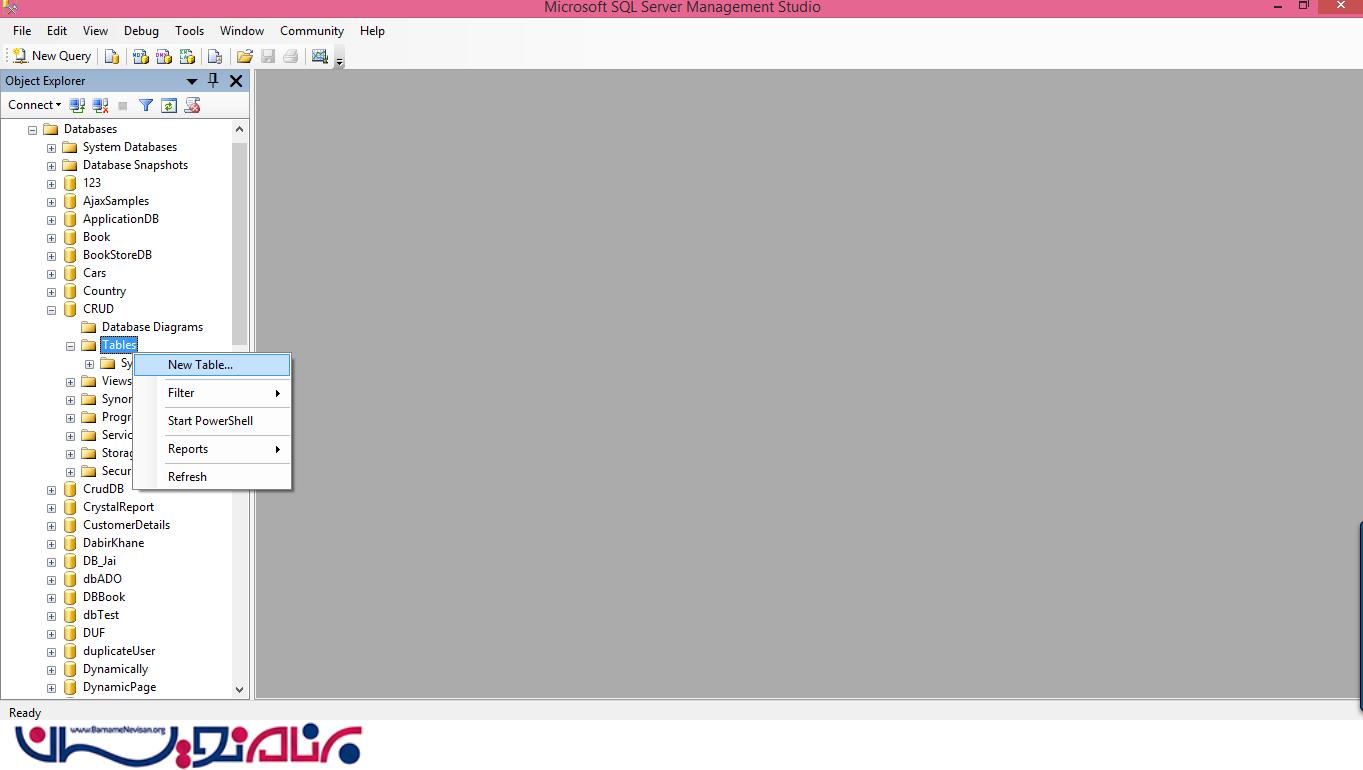 یک جدول جدید ایجاد کنید.( CRUD database را از حالت فشرده خارج کنید و بر روی Tables کلیک راست کنید و سپس New Table را انتخاب کنید.)