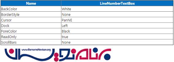 BackColor و ForeColorو property های برای LineNumberTextBox را مانند بالا تنظیم میکنیم.