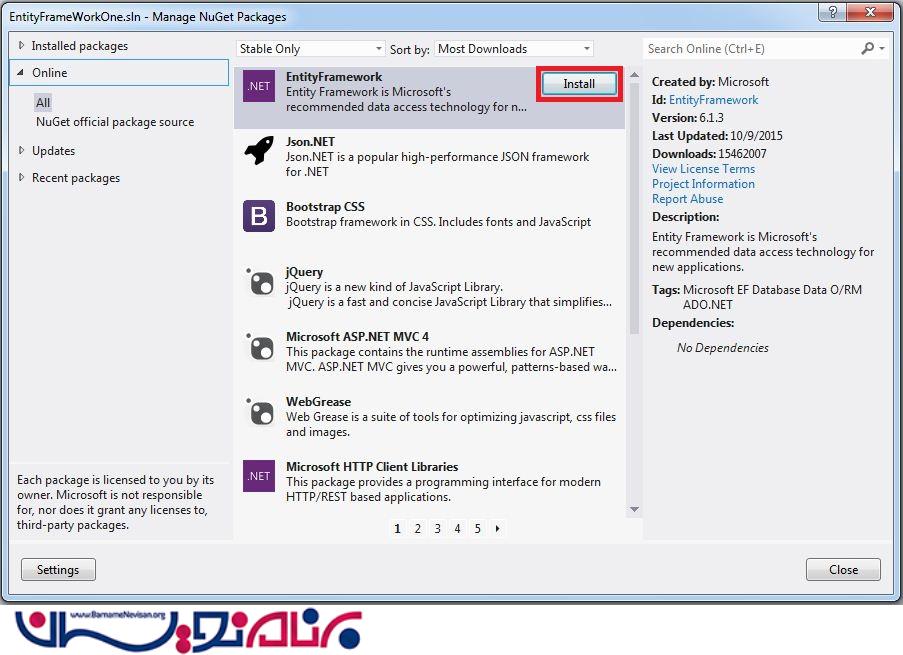 سپس EntityFramework را از طریق Nuget نصب می کنیم: