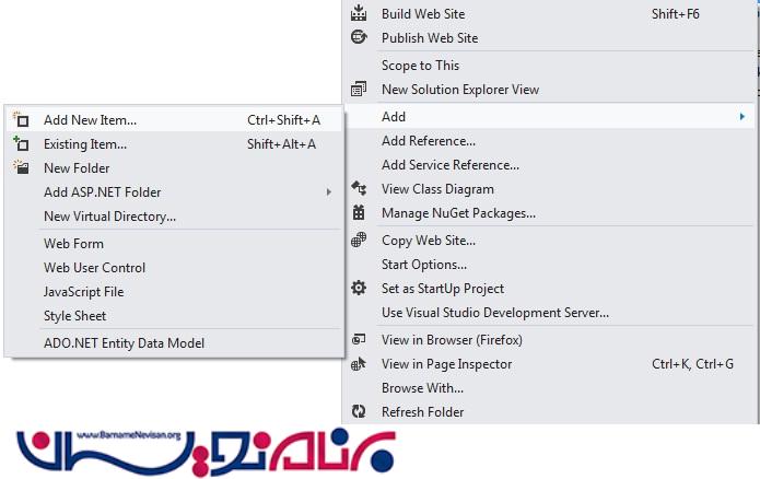 بر روی نام پروژه راست کلیک کرده و Add و سپس Add New ITtem را انتخاب کنید: