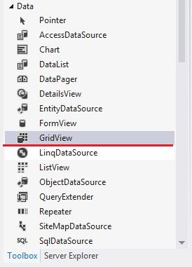 یک GridView از تب Data انتخاب کرده و به روی صفحه بکشید: