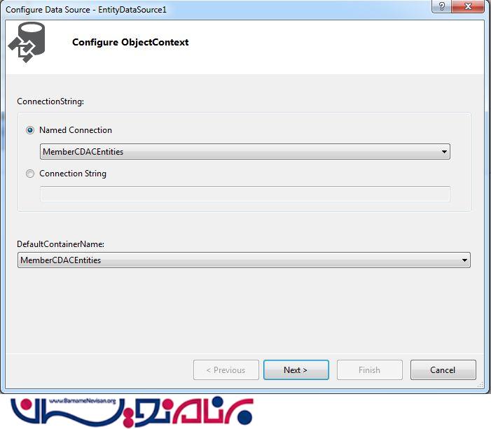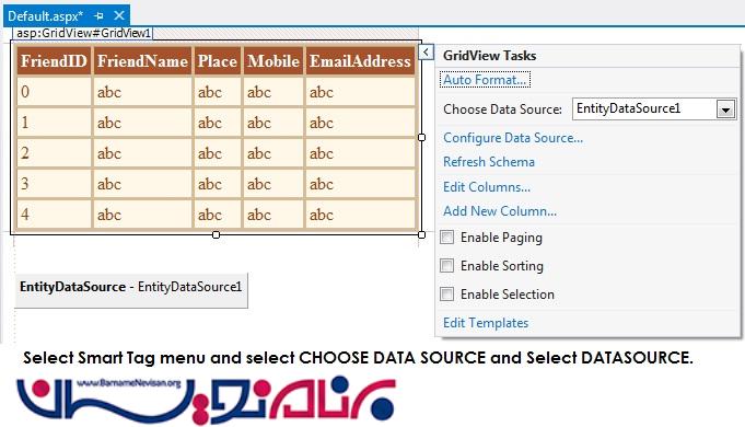 یک EntityDataSource از کنترل ها کشیده و روی صفحه رها کنید: