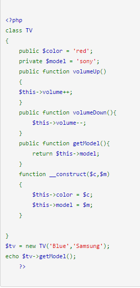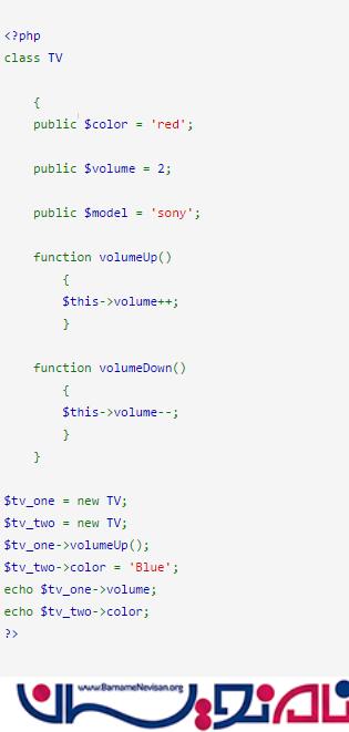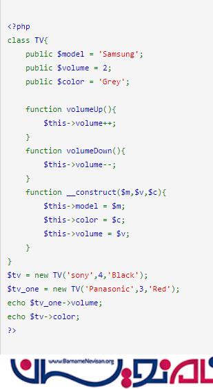 مرحله قبل برای فراخوانی یک تابع است که ایجاد شده است. برای فراخوانی تابع باید یک شیئ ایجاد کنید. در این syntax همانطور که می بینید ما دو Object ایجاد کرده ایم و آن ها را در دو متغیر به صورت $tv_one و $tv_two ذخیره کرده ایم.