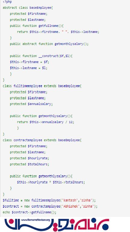 در کد زیر ما یک کلاس abstract با نام baseEmployee ایجاد کرده ایم و آن را به عنوان کلاس والد در نظر گرفته ایم. در اینجا یک تابع در کلاس والد ایجاد کرده ایم. ما یک کلاس abstract در کلاس والد با نام () getmonthlysalary ایجاد کرده ایم. کلاس Abstract فقط میتواند اعلان شود اما پیاده سازی نشده است. شما می توانید آن را در هر نقطه از کلاس ایجاد شده پیاده سازی کنید. کلاس abstract ایجاد شده باید حداقل یک بار در هر کلاس گنجانده شود. بعد از آن شما می توانید از توابع و رفتارهای دیگر هم استفاده کنید.
