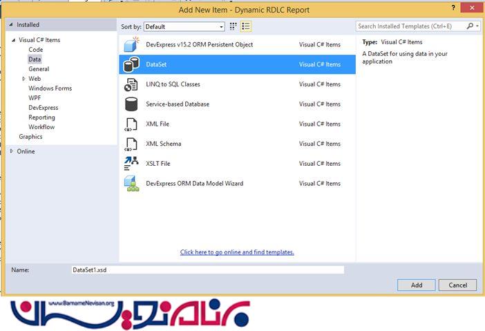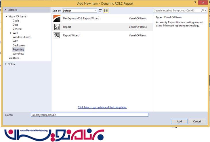 مرحله 4 : در این مرحله ، یک RDLC report به پروژه اضافه کنید و نام آن را " EmployeeReport" قرار بدهید.