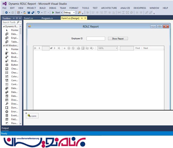 مرحله ی 2 : یکtextbox ، یکbutton ، یک report viewerو یکlabel از قسمتtoolbox به درون فرم بکشید و نام label را "شماره ی کارمند" بگذارید . یک Oledb connection اضافه کنید.