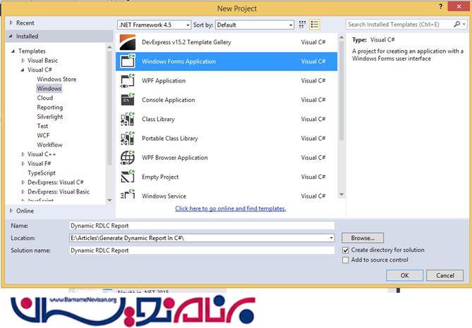 مرحله ی 1 : یک پروژه ی جدید به نام “Dynamic RDLC Report” ایجاد کنید و بر روی ok کلیک کنید.