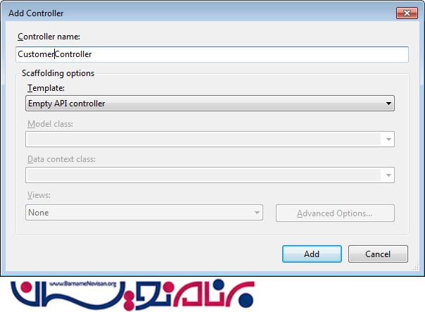 یک Controller اضافه کنید و نام آن را CustomerController بگذارید.