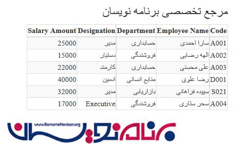 var displayField = 'Code,EmployeeName,Dept,Desig,Salary';