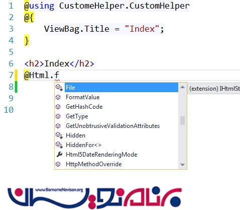 یک پروژه از نوع mvc ایجاد نمایید و داخل آن یک کلاس به نام customehelper ایجاد نمایید، یک extension method در این کلاس استاتیک ایجاد نمایید.