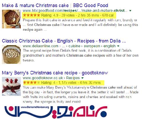 گوگل گاهی اوقات برای استخراج برخی متادیتا ها از نتایج جستجو تلاش می کند تا ورودی ها را در لیست نتایج جستجو افزایش دهد. تصویر قبلی تاریخ مقاله را به عنوان بخشی از توضیح آن نمایش داده است. جستجو های دیگر می تواند شامل داده های ساخت یافته بیشتر در قالب آنچه که گوگل به آن به عنوان "Rich Snippets" اشاره می کند باشد، تصویر بعدی یک نتیجه جستجو را برای "christmas cake recipe" نشان می دهد: