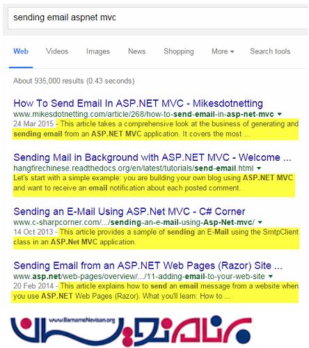 تصویر بالا نشان می دهد که چگونه گوگل از meta description ها در نتیجه جستجو برای "sending email aspnet mvc" استفاده می کند. اگر کل طول آن بیش از 160 کاراکتر باشد گوگل همیشه از meta description به طور مشخص استفاده نمی کند . این متن گوگل ارائه شده، اگر این احساس کند که مناسب تر از محتوای meta description است، از محتوای صفحه خودش گرفته می شود. در این مورد مشخص توضیحات ما با یک روش کامل به 160 کاراکتر محدود شده و تعداد کاراکترهایی که گوگل برای استفاده انتخاب می کند توسط توضیح خود برای تاریخ داده در آغاز توضیح محدود می شود.