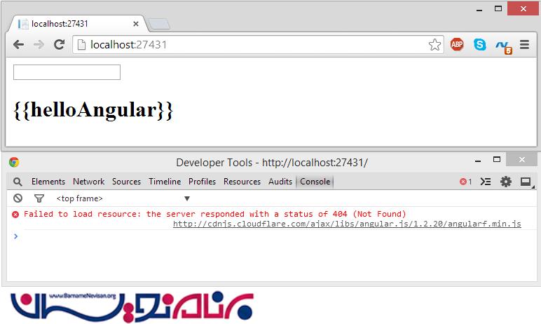 اگر چیزی شبیه به {{helloAngular}} مشاهده کنیم، جایی در پروژه اشتباهی رخ داده است. در chrome می توانید آن را با استفاده از F12 و انتخاب تب Console مشاهده کنید. در زیر به دلیل اشتباه نوشتن آدرس برنامه کار نخواهد کرد.