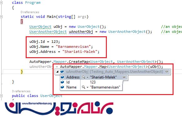 حالا که این کار انجام شده است ما یک Mapper بین کلاس UserObject و کلاس UserAnotherObject ایجاد می کنیم. این عمل با استفاده از کد زیر انجام می شود:
