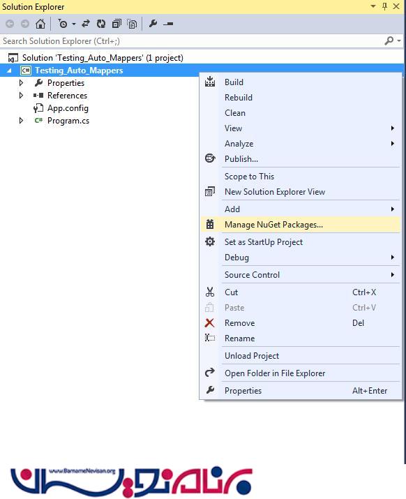 به منظور استفاده از AutoMapper ابتدا باید آن را از Nuget Package Manager به صورتی که در زیر نشان داده شده است، نصب کنیم: