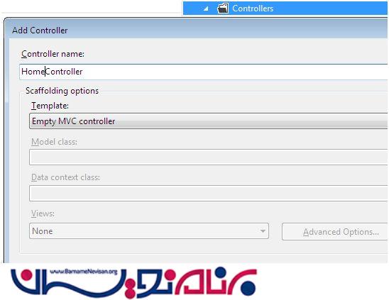 مرحله 2 : یک کنترلر خالی به نام Home ایجاد کنید. (بر روی controller کلیک راست کرده و گزینه add new controller را انتخاب کنید.)