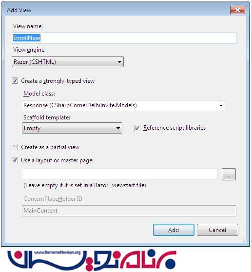 بر روی آن کلیک راست کنید و یک view از نوع strongly typed مطابق تصویر زیر ایجاد کنید: