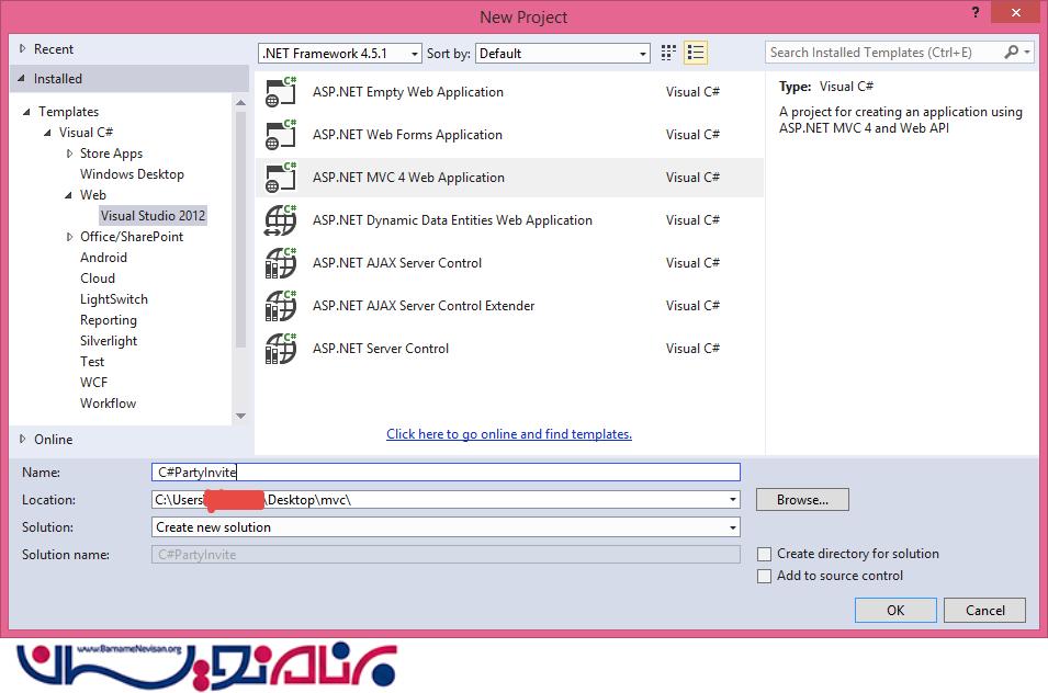 مرحله 1 : گزینه ی MVC 4 empty project و نام آن را C#PartyInvite بگذارید.