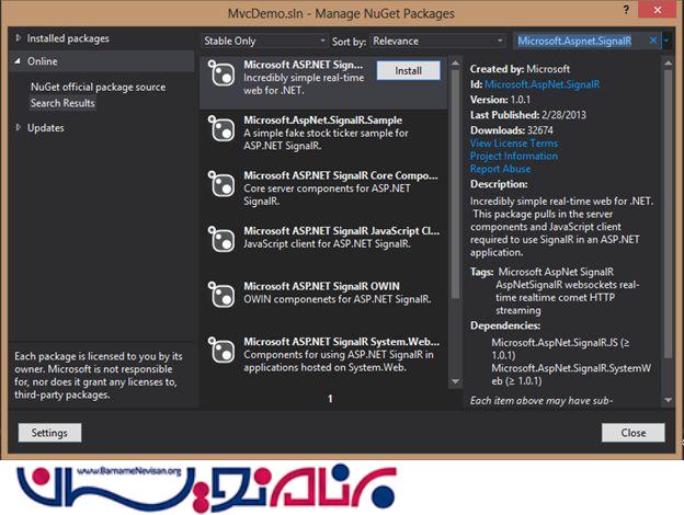 در تب Tools گزینه Library Pakage Manager و سپس Manage Nuget Pakage را انتخاب میکنیم. در اینجا Microsoft.Aspnet.SignalR را جستجو و نصب میکنیم.