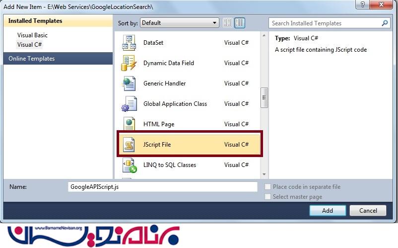 در این قسمت یک فایل JavaScript به Solution Explorer اضافه میکنیم تا با استفاده از آن بتوانیم Google Maps JavaScript API را فراخوانی کنیم.