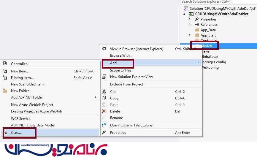 حالا اجازه بدهید یک Model Class به نام EmpModel.cs ایجاد کنیم. برای این کار بر روی پوشه model کلیک راست می کنیم و مطابق تصویر زیر عمل می کنیم :