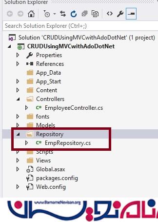 حالا یک پوشه به نام Repository ایجاد کنید و کلاس EmpRepository.cs که مربوط به عملیات مرتبط با پایگاه داده است را به آن اضافه کنید. بعد از این مرحله، Solution explorer به صورت زیر خواهد بود :