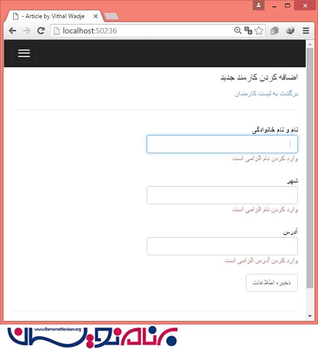 اگر بدون وارد کردن اطلاعات ، بر روی دکمه Save کلیک کنیم، مطابق شکل زیر خطاهایی ظاهر خواهند شد :