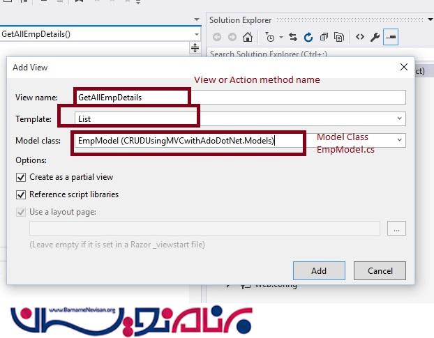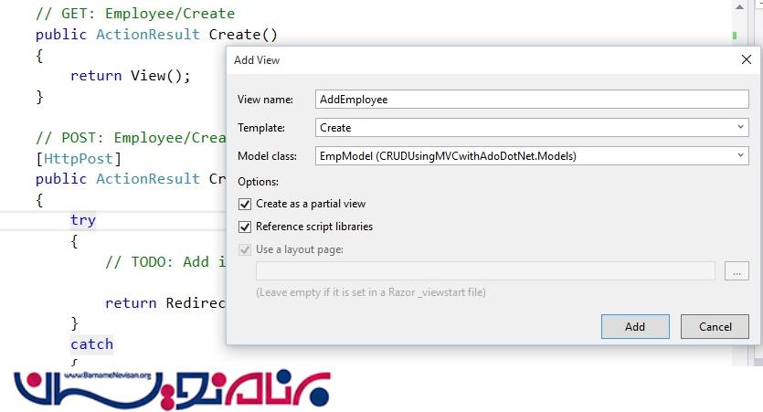 برای ایجاد یک Partial View برای افرودن افراد جدید، بر روی متد ActionResult کلیک راست کرده و سپس بر روی view کلیک کنید. یک نام برایview ، یک نام برای template و همچنین model class مورد نظرتان را انتخاب کرده و سپس بر روی دکمه Add کلیک کنید. از عکس زیر برای این مرحله کمک بگیرید :