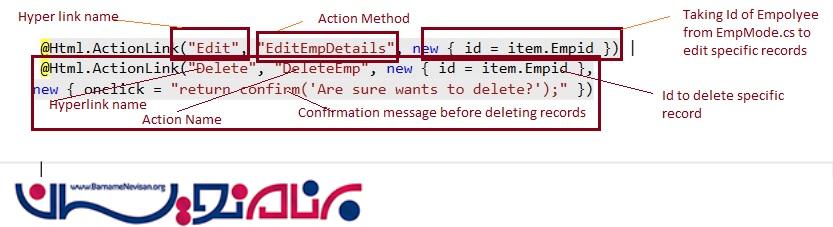 من Action Link بالا را در GetAllEmpDetails.CsHtml اضافه کرده ام زیرا به روز رسانی و حذف داده ها از آن قسمت باید انجام بگیرند.
