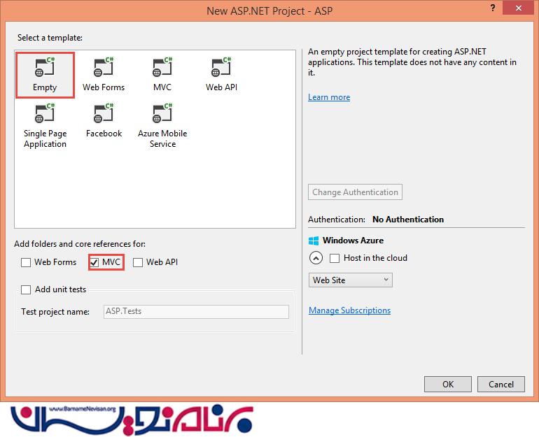 3-همان طور که در تصویر بالا می بینید بر روی Empty کلیک کرده و سپس گزینه MVC را انتخاب کنید و سپس بر روی OK کلیک کنید. این کار برای شما یک empty MVC web application ایجاد می کند که قسمت Solution Explorer آن مطابق زیر است :