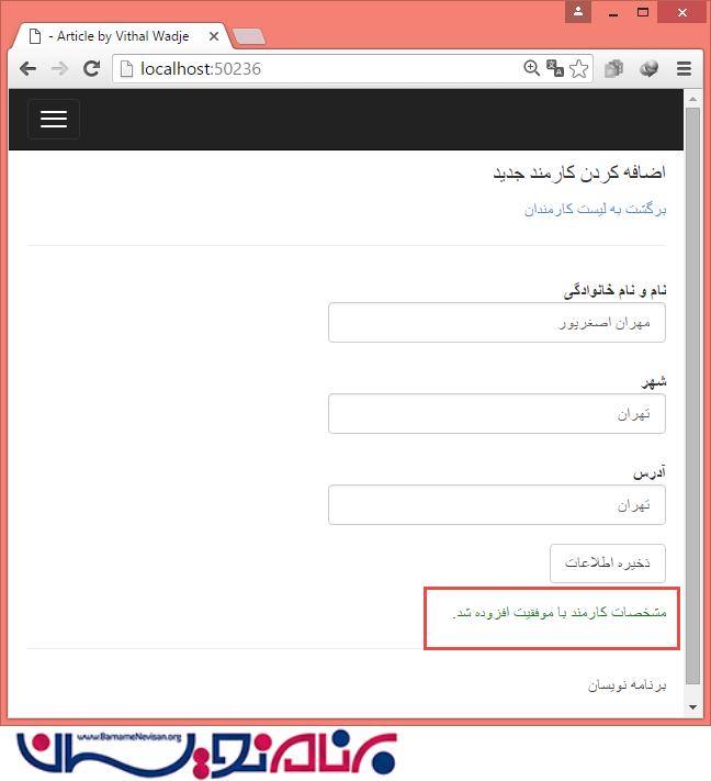 حالا جزئیات مورد نظر خودتان را وارد کنید و بر روی دکمه ی ذخیره اطلاعات کلیک کنید، رکورد های در پایگاه داده درج خواهند شد و پیام زیر برای شما ظاهر خواهد شد: