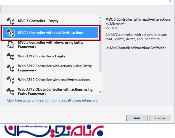 بعد از کلیک کردن بر روی دکمه ی Add ، کنترلر ساخته می شود . این کنترلر به صورت پیش فرض شامل کدهایی است که از عملیات CRUD پشتیبانی می کند. در ادامه ی مقاله ما آن ها را مطابق با نیازهای خودمان تغییر می دهیم.