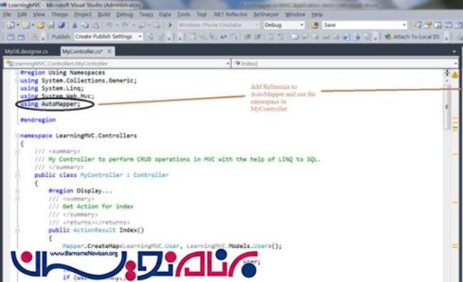 همانطور که می بینید AutoMapper در پروژه ، reference داده شده است. حالا از فضای نام AutoMapper مطابق شکل زیر استفاده می کنیم :