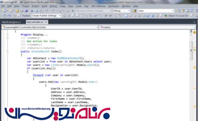 درک مفهوم کدی که در بالا نوشته شده است، چندان سخت نیست. در کد بالا ، یک نمونه از MyDBDataContext به وسیله ی LinqTOSql Context class ساخته شده است (using "var dbContext = new MyDBDataContext();") سپس جزئیات اطلاعات کاربر از یک جدول خاص گرفته می شوند و در متغیر userDetails ذخیره می شوند. ما یک مدل از پیش ساخته شده به نام "User" داریم ("LearningMVC.Models.User()") ، که دارای Property های مشابه با Users class هایی است که از پایگاه داده تولید شده اند. حالا ما Property های نمونه ای که از model ساختیم را با Property های نمونه ای که از User class (از پایگاه داده) ساختیم ، مقداردهی می کنیم ، به این روشی که گفتیم می توانیم view ها را در MVC پر کنیم .