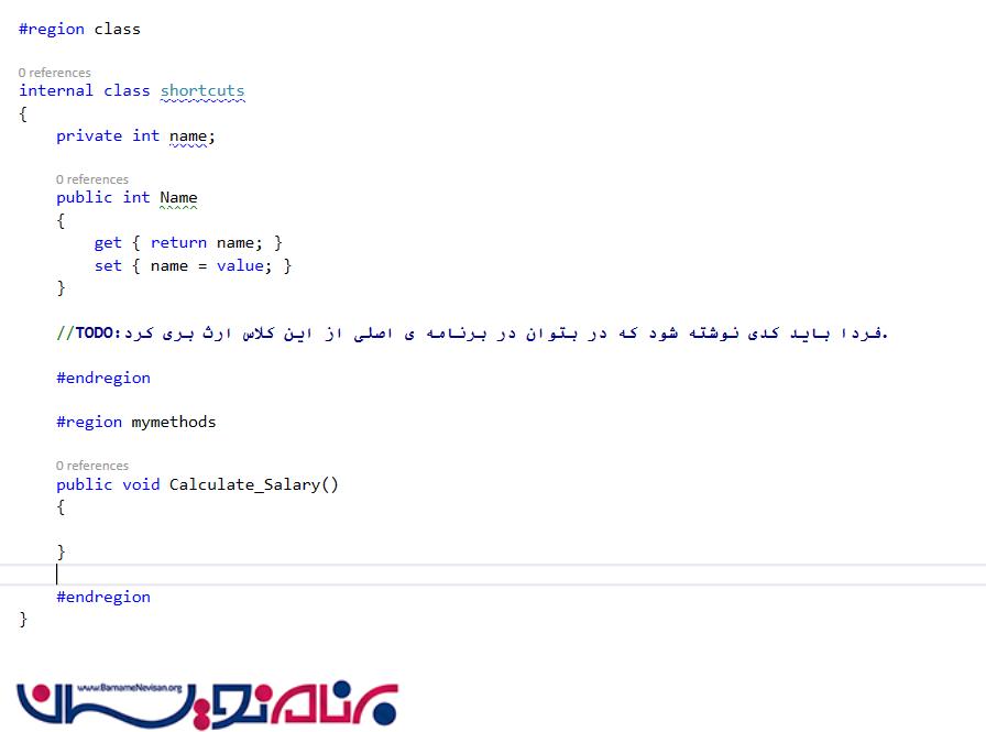 با #region دستور شروع میشود و #endregion دستور خاتمه پیدا میکند. در قسمت شروع دستور میتوانید یک نام برای Region انتخاب کنید. همانطور که می بینید در قطعه کد بالا ما دو region به نام "Class" و "mymethods" داریم.