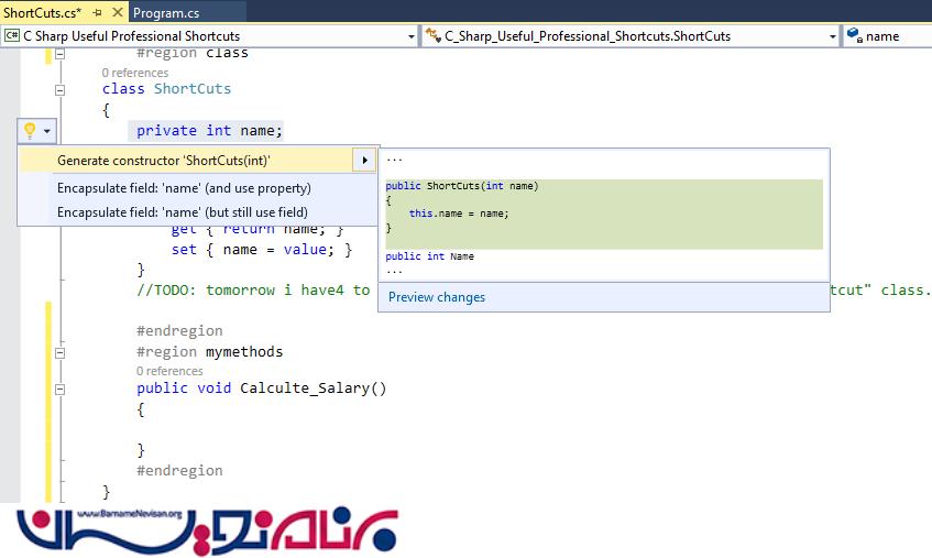 کد مربوط به "private int name" را انتخاب کنید و سپس کلید میانبر Ctrl+ را فشار دهید .با این کار به شما پیشنهاد میشود که یک constructor یا encapsulation برای این متغیر تعریف کنید. هنگامیکه گزینه ی ایجاد constructor یا encapsulation را انتخاب کنید یک constructor یا encapsulation به متغیر موردنظر اضافه میشود.