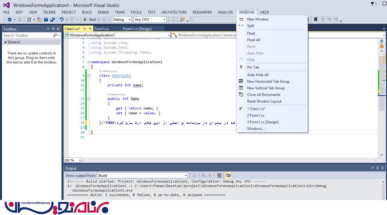 برای این کار، ابتدا پنجره هایی که مورد نیازتان میباشد و هنگام کار با ویژوال استودیو به آن نیاز دارید را در محیط IDE باز کنید. برای مثال همانطور که در تصویر زیر میبینید ما پنجره "Toolbox" را در سمت چپ باز میکنیم. در سمت راست پنجره "Solution Explorer" و در وسط پنجره coding window را قرار میدهیم. بعد از افزودن و تنظیم پنجره های موردنیاز و دلخواه خود ، منو Window را باز میکنیم و گزینه ی "Save Window Layout" را انتخاب میکنیم.کلید میانبر برای ذخیره کردن Layout ، (Ctrl+Alt+1) میباشد.