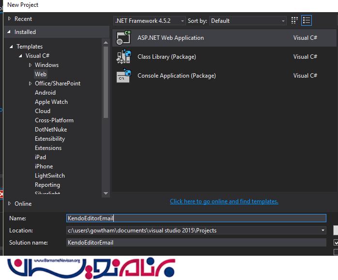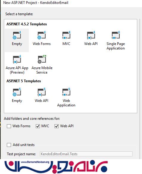 برای این کار یک برنامه Web API با نام KendoEditorEmail به صورت زیر ایجاد میکنیم.