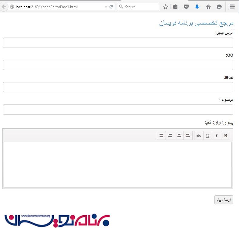 یک صفحه Html به صورت زیر با نام KendoEditorEmail ایجاد میکنیم. کدها در این صفحه به صورت زیر خواهد بود: