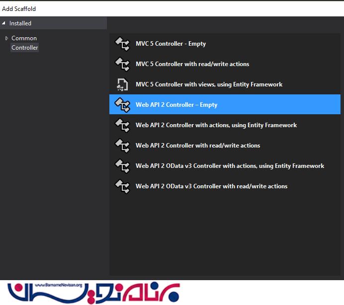 برای ایجاد کنترلر، بر روی پوشه Controller کلیک راست کرده و کنترلری با نام EmailController به صورت زیر ایجاد میکنیم.