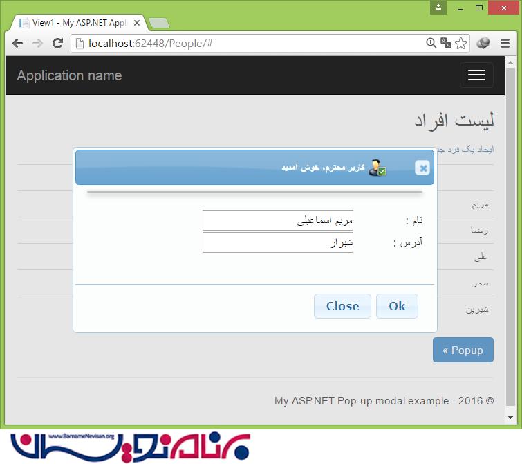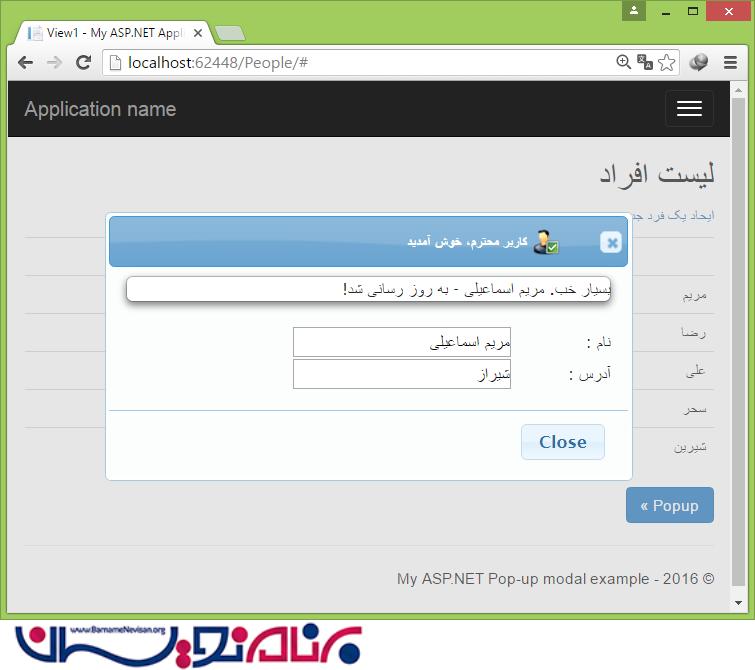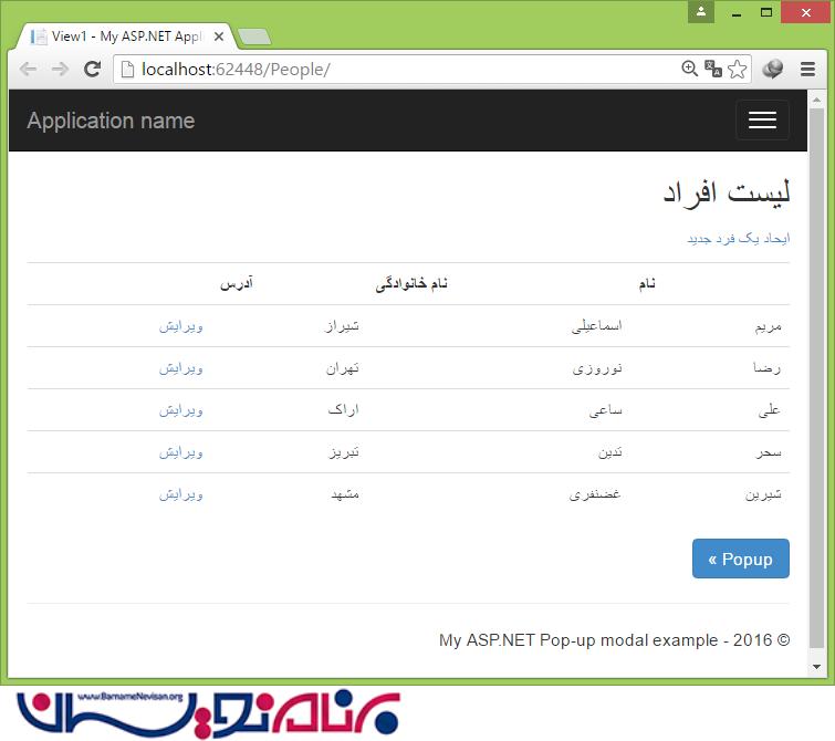 شنبه 1 خرداد 1395در این مقاله با استفاده از تکنولوژی های jQuery و ASP.net MVC برنامه ای می نویسیم که در آن لیستی از افراد نشان داده شود و برای ویرایش یک پنجره ی POP-UP در اختیارکاربر قرار بگیرد.