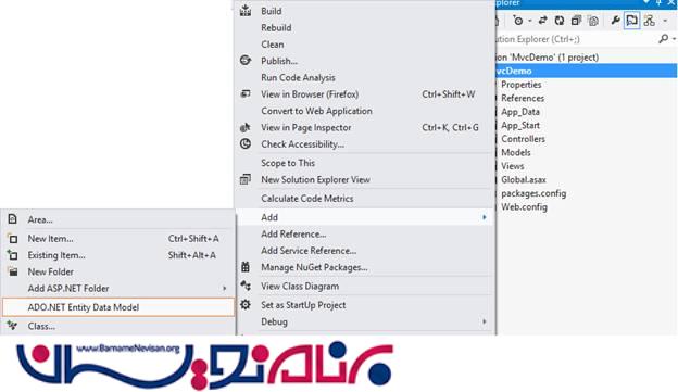 به Solution Explorer بروید و بر روی Project کلیک راست کنید و ADO.NET Entity Data Model را انتخاب کنید.