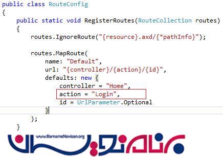 به قسمت RouteConfig.cs بروید و مطابق زیر نام action را از Index به Login تغییر بدهید.