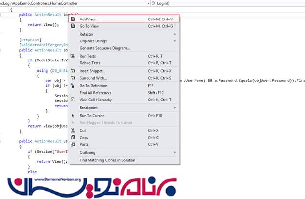 بر روی Login Action method کلیک راست کرده و سپس گزینه ی Add View را مانند شکل زیر انتخاب کنید.