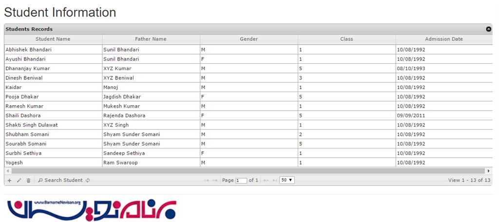 7. colNames: ['ID', 'Student Name', 'Father Name', 'Gender', 'Class', 'Admission Date'],