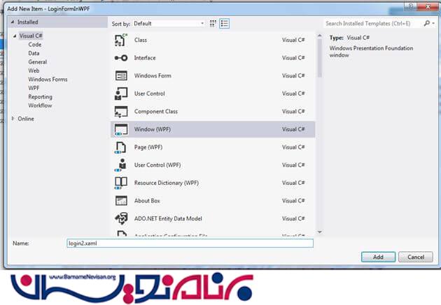 6-یک پنجره ی جدید به پروژه اضافه کنید و نام آن را “login2.xaml” بگذارید.
