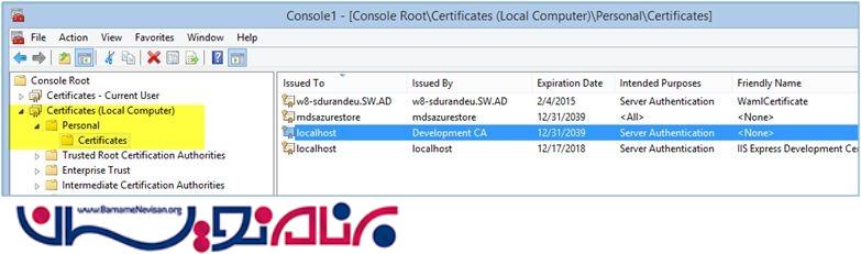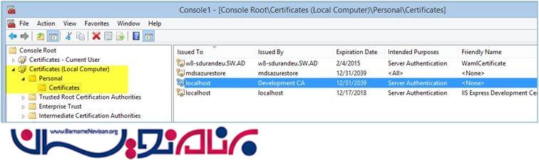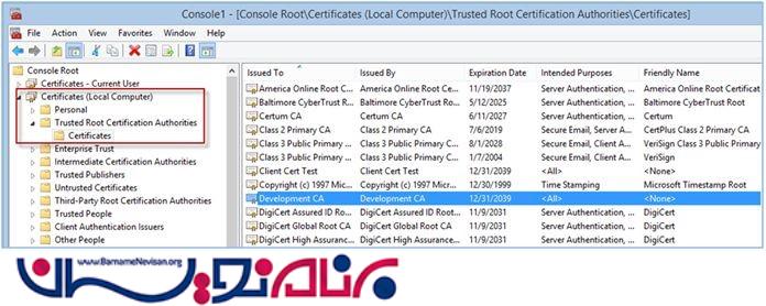 1. certificate از نوع Certificate.cer در root مربوط به Certification Authorities نصب کنید تا سیستم محلی شما از MMC (روی فولدر Trusted Root Certification Authorities | Import | All Tasks دابل کلیک کنید) استفاده کند.