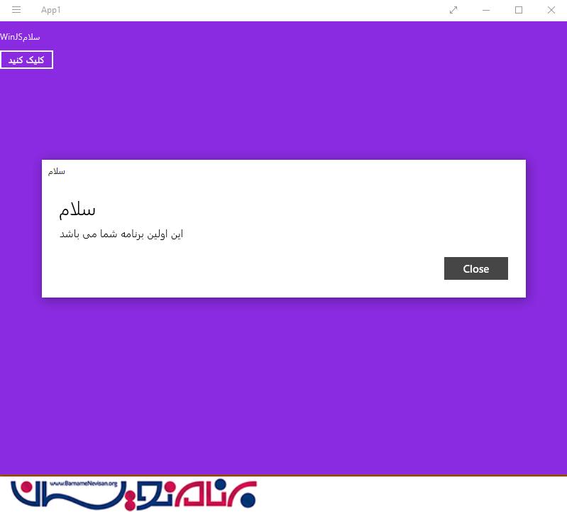 <!DOCTYPE html> 2. 3. <html> 4. 5. <head> 6. 7. <meta charset="utf-8" /> 8. 9. <title>Hello_WinJS</title> 10. 11. <!-- WinJS references --> 12. 13. <link href="//Microsoft.WinJS.2.0/css/ui-dark.css" rel="stylesheet" /> 14. 15. <script src="//Microsoft.WinJS.2.0/js/base.js"></script> 16. 17. <script src="//Microsoft.WinJS.2.0/js/ui.js"></script> 18. 19. 20. 21. <!-- Hello_WinJS references --> 22. 23. <link href="/css/default.css" rel="stylesheet" /> 24. 25. <script src="/js/default.js"></script> 26. 27. <script src="js/script.js"></script> 28. 29. </head> 30. 31. <body> 32. 33. <p> WinJS سلام</p> 34. 35. <button onclick="showDialog()">کلیک کنید</button> 36. 37. </body> 38. 39. </html>