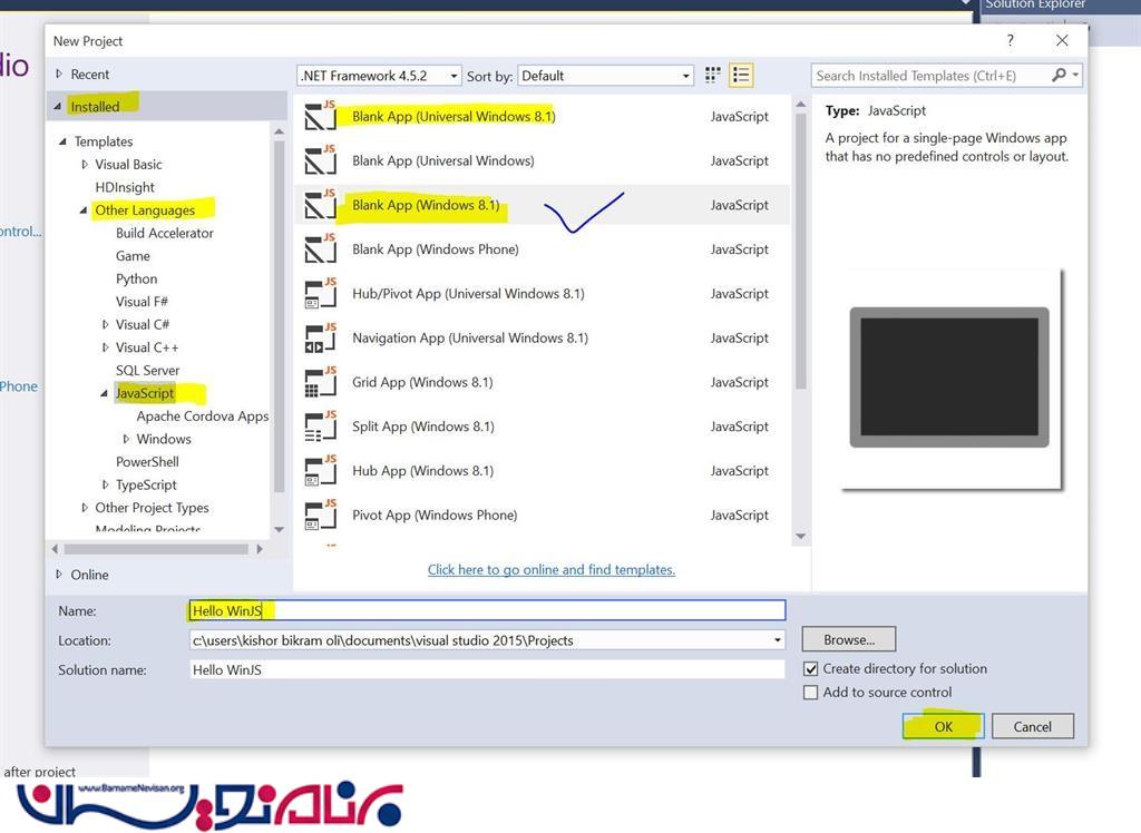 یک پروژه جدید ایجاد کنید.به New ،Fileو سپس Project بروید.در بین زبان های زیر ، روی JavaScript کلیک کنید.سپس (Universal Windows)Blank App یا Blank APP(Windows 8.1)را انتخاب کنید.
