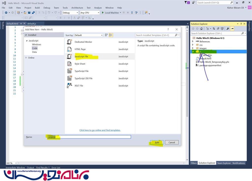 شما باید برنامه را ایجاد کنید.حال شما در default.html، Solution explorerرا خواهید دید.برای باز کردن Solution Explorer به View بروید وSolution Explorer را بزنید و یا دکمه های Ctrl+W+S را بزنید.